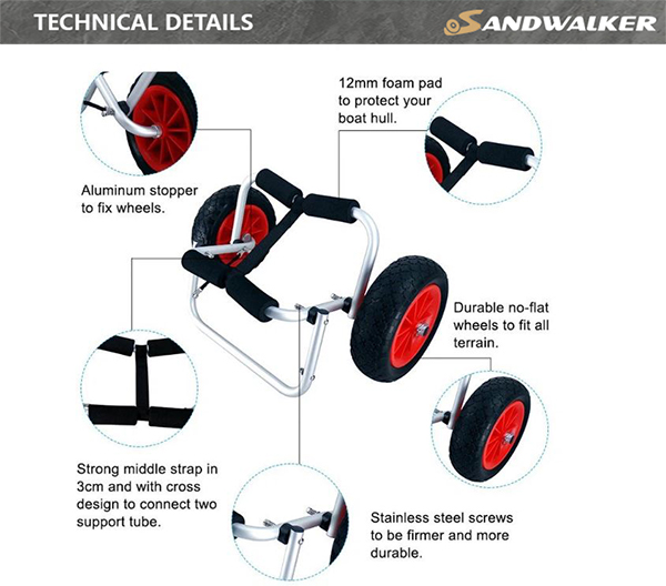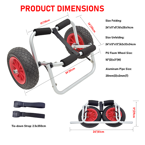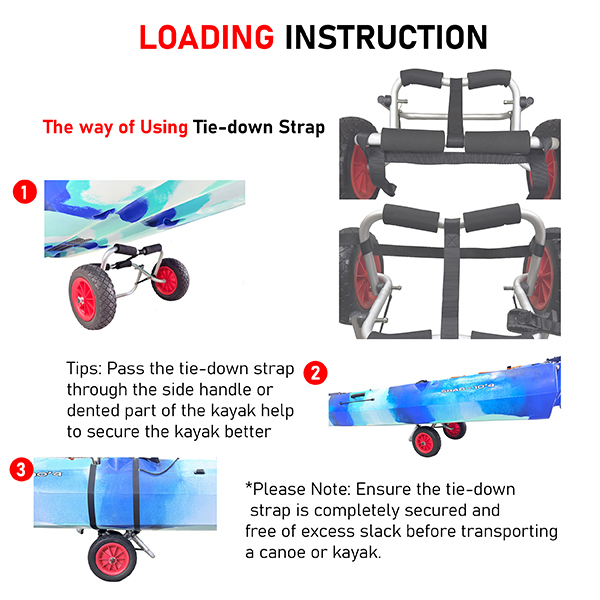 Để bảo đảm an toàn hơn cho thuyền kayak hoặc ca nô của bạn trong quá trình vận chuyển, xe đẩy bao gồm hai dây buộc dài 1 inch x 12 feet.